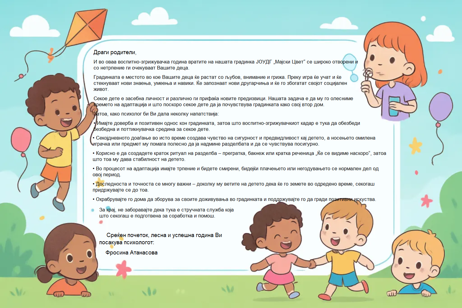 И дури детството кружи околу нас, ние растеме и кога еден ден училиштето ќе ни се насмевне нашата прва учителка ќе не испрати, а ние секогаш градинката и спомените во неа ќе ги чуваме во нашето срце да ги раскажуваме, да се сеќаваме на нашето детство.